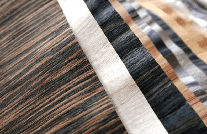 Finishing ini menggunakan lapisan plywood dengan motif atau tekstur tertentu yang sudah jadi, lalu diaplikasikan ke permukaan pintu. Cocok untuk produksi massal karena cepat dan efisien. Pilihannya terbatas, tetapi cukup untuk kebutuhan standar proyek.